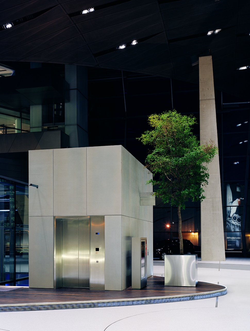COOP HIMMELB(L)AU의 건축가들은 공개 국제 공모전에서 우승하는 데 성공했습니다. 그들의 중심 디자인 아이디어는 새로운 BMW Welt를 BMW 타워와 박물관의 시각적 이미지에 통합하여 정체성을 형성하는 앙상블을 만들어 냈습니다. 크고 투명한 홀과 조각적인 지붕이 이 컨셉의 핵심입니다. 내부의 일부 영역은 콘크리트 스킨 패널로 마감되었습니다.