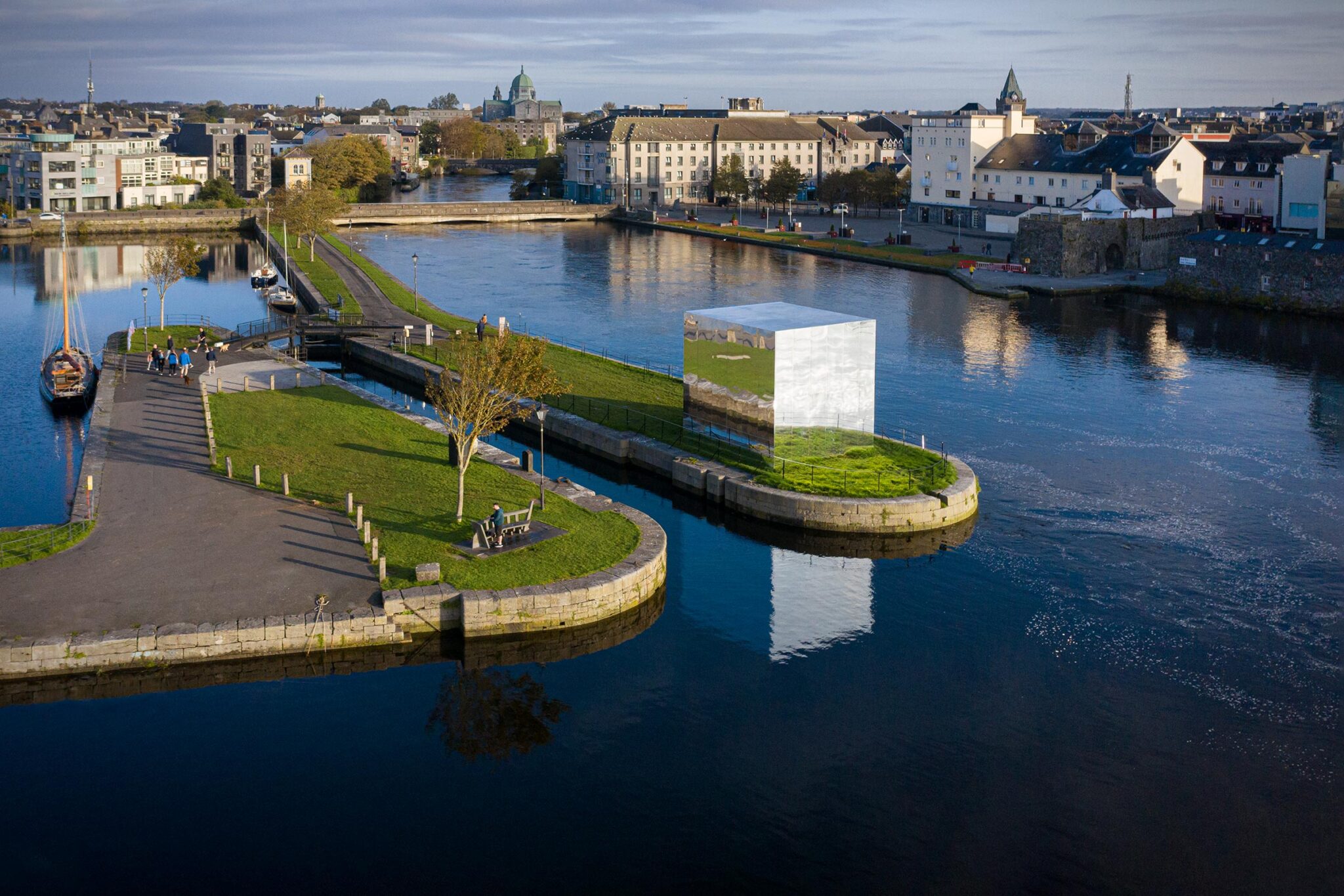 John Gerrard의 Mirror Pavilion은 유럽 문화 수도인 Galway 2020을 위한 Galway International Arts Festival의 의뢰를 받았습니다. 파빌리온은 3면과 지붕이 반사 거울로 덮여 있고 네 번째 벽은 고해상도 LED 벽으로 이루어진 아름답고 눈에 띄는 구조입니다.