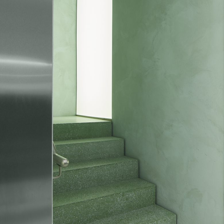 셀프 포트레이트(Self-Portrait)는 인테리어에 대해 "공간 디자인과 자기 반사 아이디어에서 영감을 받아 크롬과 거울을 포함한 다양한 질감의 특징이 내부 벽을 지배하고 민트 그린 톤의 표면을 반사합니다"라고 말했습니다.