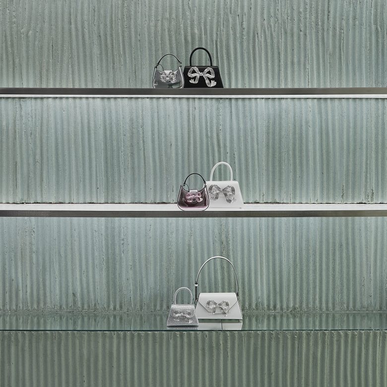 Self-Portrait의 기성복 컬렉션은 창문 앞의 크롬 마감 옷걸이에 전시되었으며 액세서리는 크롬 디스플레이 테이블에 정리되어 있습니다.