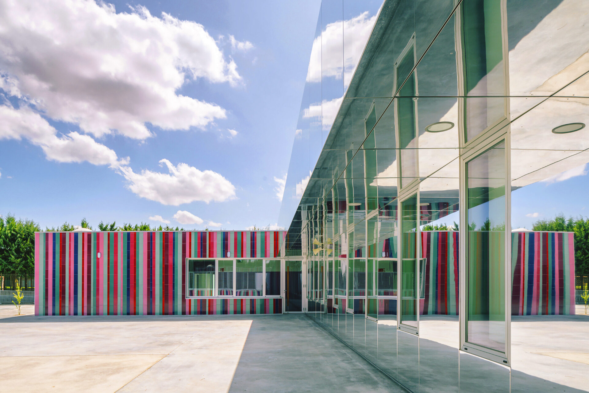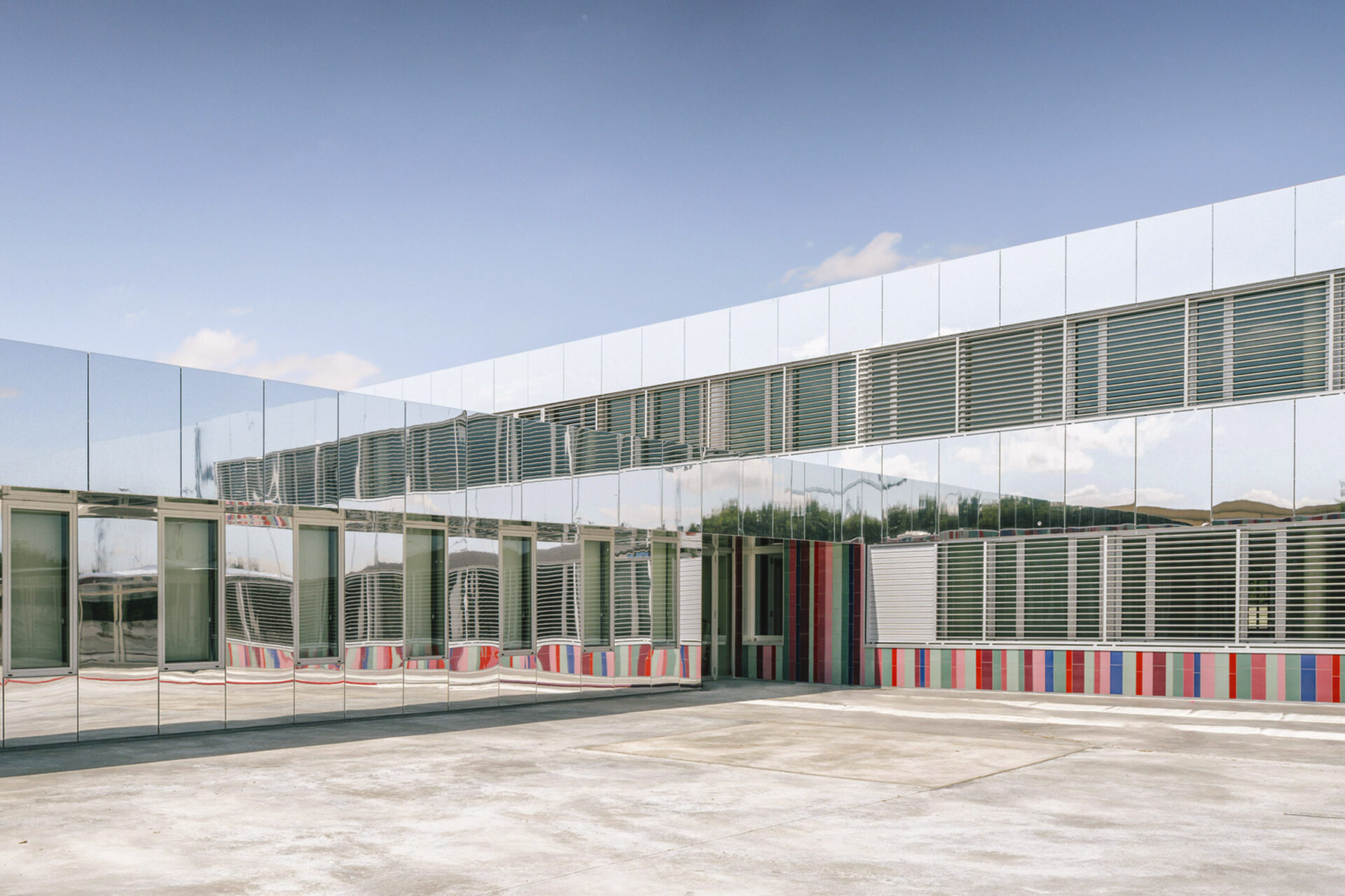 ABLM Arquitectos의 스페인 학교 벽을 덮고 있는 거울 패널과 줄무늬 타일